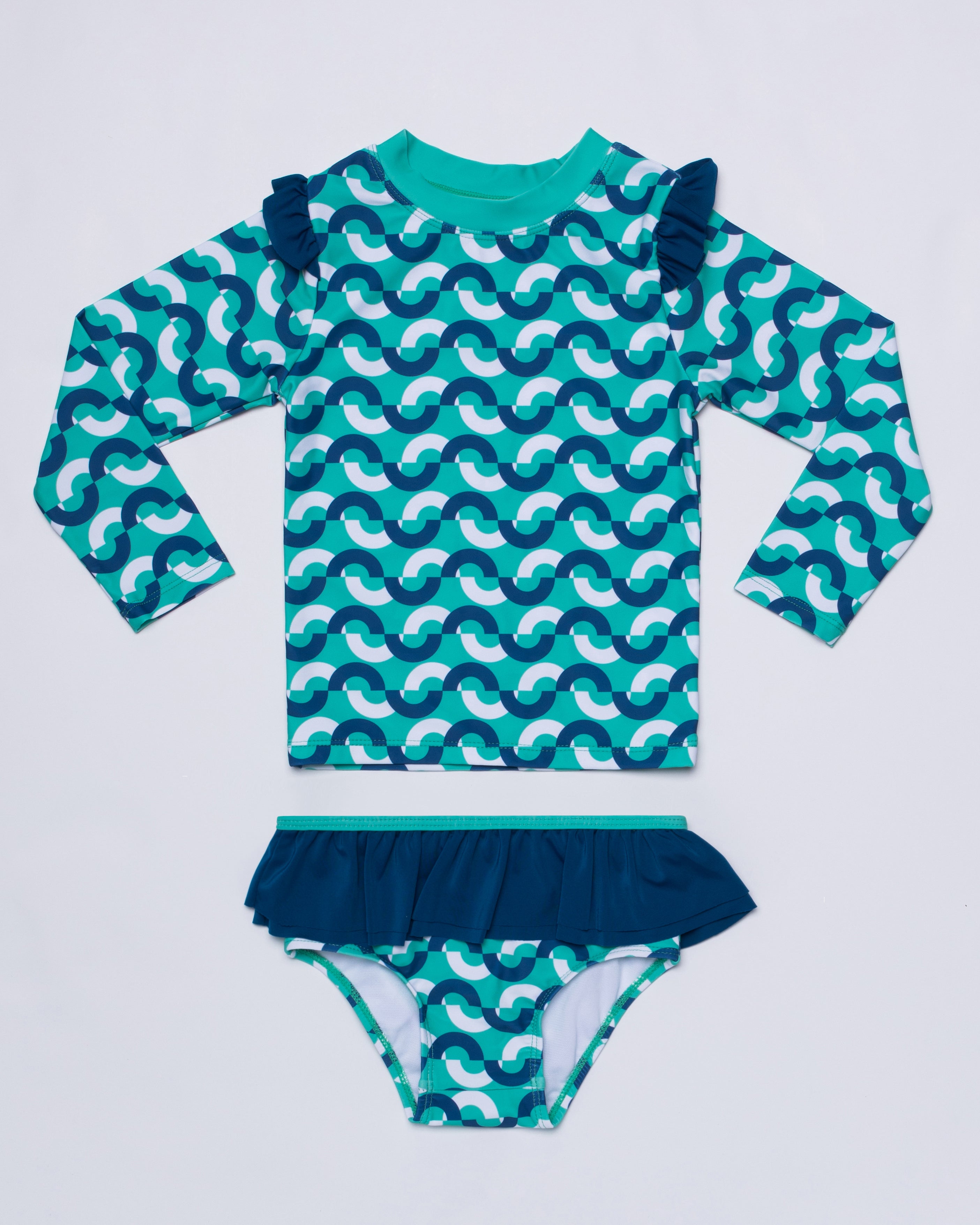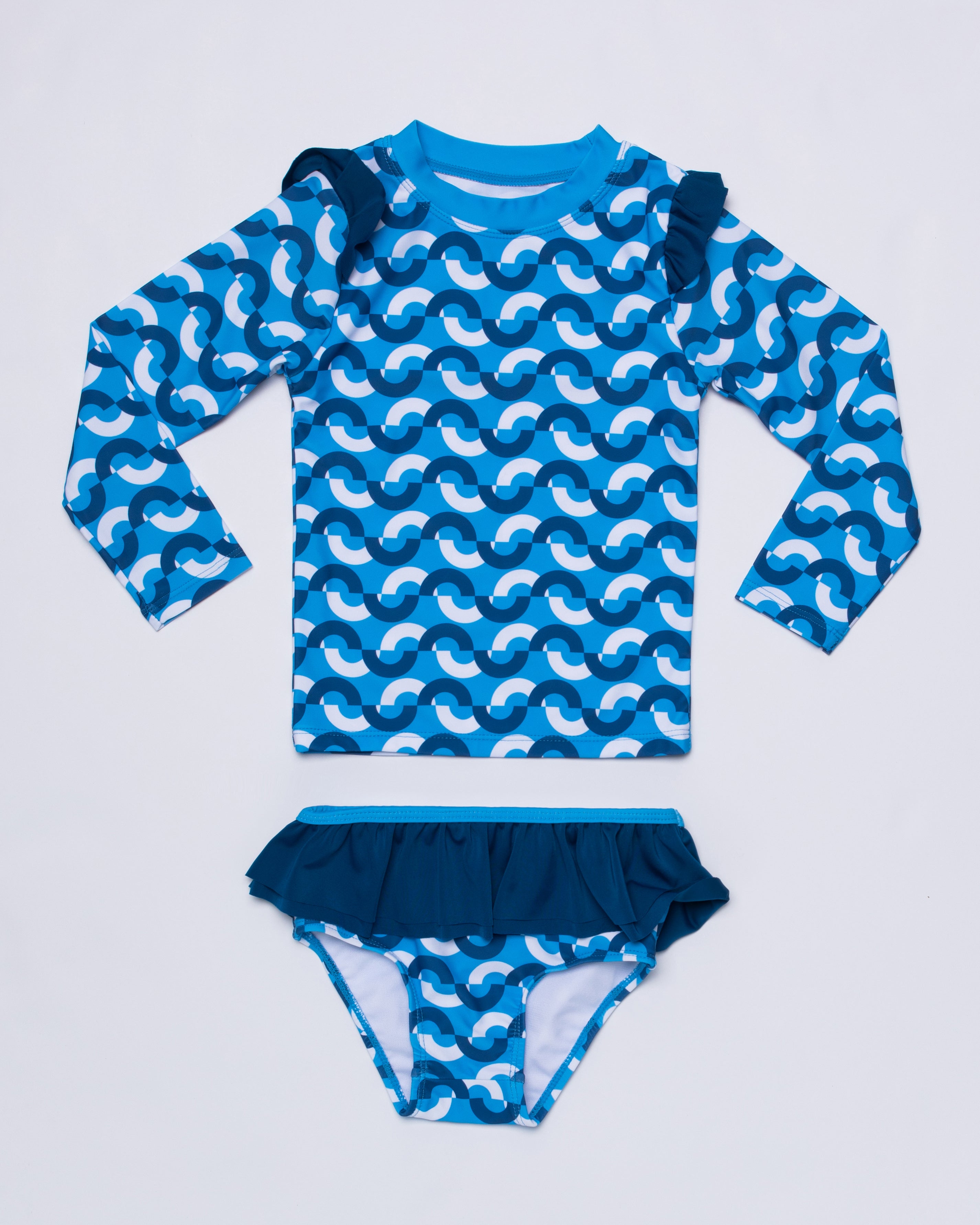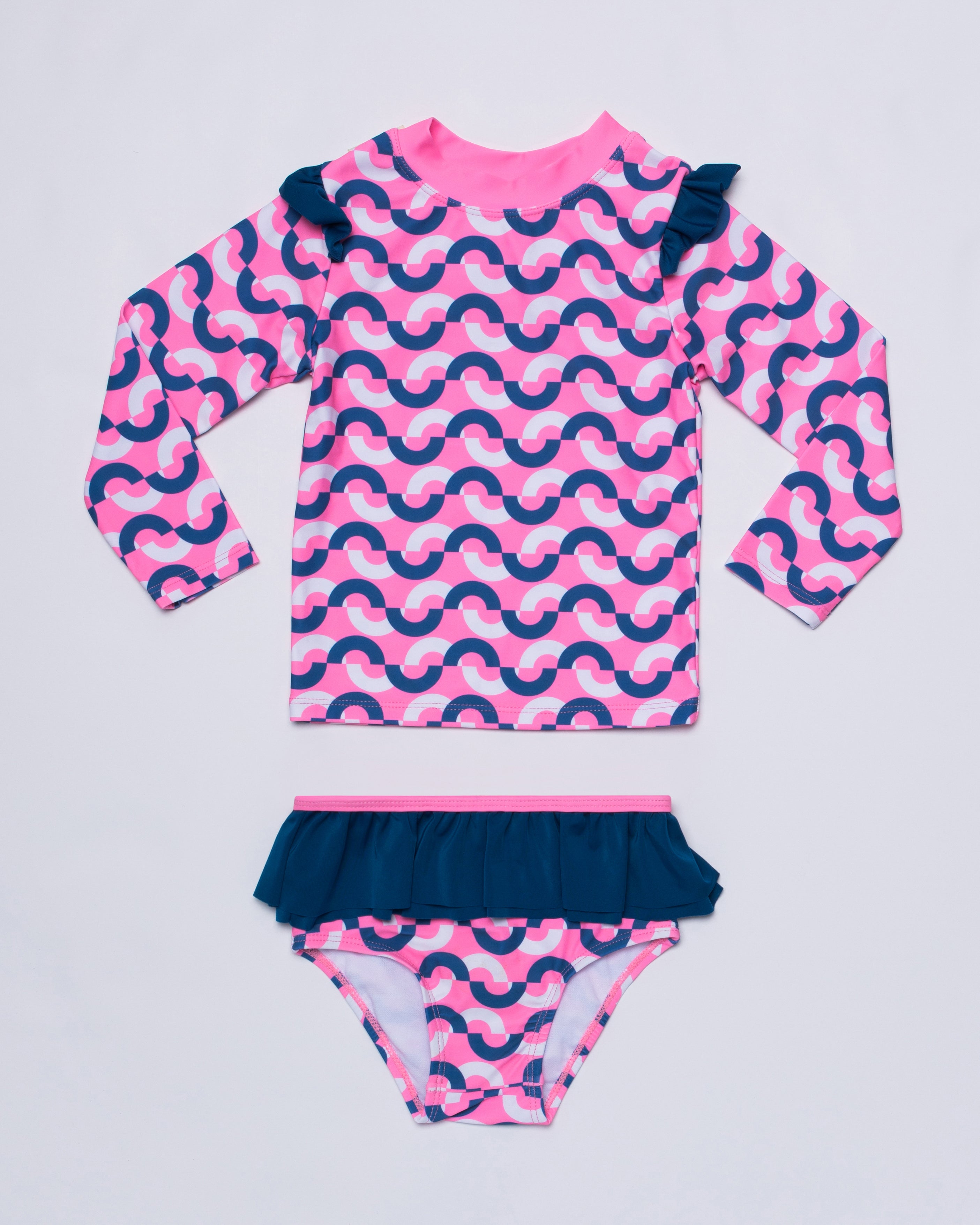 Our two-piece swimsuit features a rashguard top with cute ruffle sleeves for sun protection and a comfy bikini bottom with a playful ruffle skirt. With 3 colors to choose from, this set is a poolside must-have!